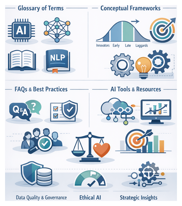 This appendix provides a unified glossary of essential terms, an overview of key conceptual frameworks, concise answers to frequently asked questions and a curated list of AI-driven tools and resources. It establishes a shared vocabulary and offers strategic, technical and ethical references to support effective implementation of AI in marketing.