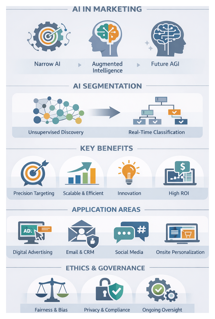 Artificial intelligence has evolved from niche automation tools into a strategic framework that shapes marketing strategy, execution, and measurement. Within this landscape, machine learning–driven audience segmentation stands out as a transformative practice, enabling organizations to move beyond static demographic buckets to dynamic, data-derived customer groups. By combining unsupervised discovery with real-time classification, AI segmentation unlocks precision targeting, scalable personalization, and continuous adaptation across channels. This chapter provides a coherent view of AI in marketing, outlines the core concepts of machine learning segmentation, explores key use cases, and addresses the operational, ethical, and strategic considerations essential for successful adoption.