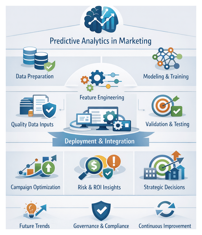 Predictive modeling leverages historical data to forecast outcomes and guide resource allocation. Tools such as Databricks and technologies from H2O.ai support collaborative model development and scalable training pipelines. Key considerations include model explainability to build stakeholder trust, drift monitoring to maintain relevance, scenario planning for strategic stress tests, and ensemble techniques for robustness using services like Amazon SageMaker or Azure Machine Learning. Integrated forecasts inform retention campaigns, media buys, and closed-loop systems where marketing automation platforms continuously refine tactics.