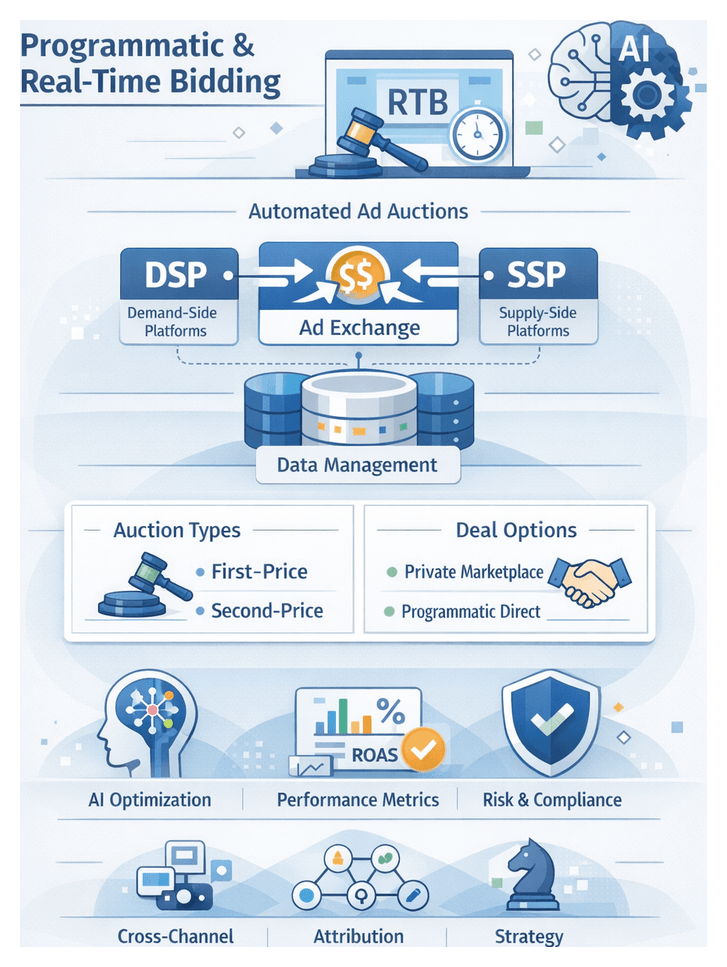 - Programmatic Advertising Automated buying and selling of ad inventory via real-time bidding (RTB) and data-driven optimization.