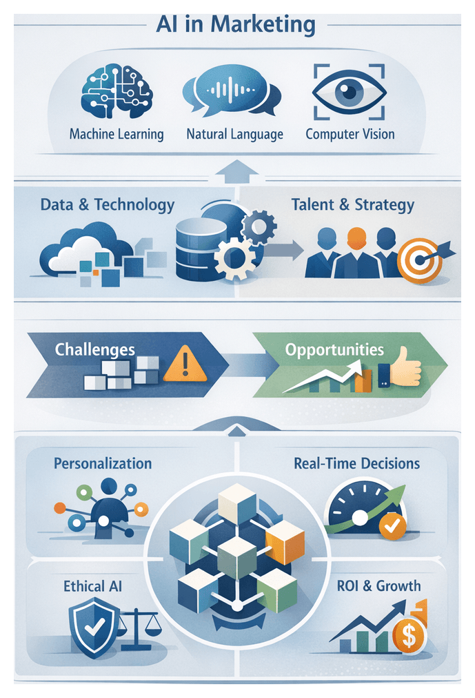 Strategic imperatives include shifting from siloed pilots to enterprise-wide AI platforms, embedding AI into the marketing operating model, balancing innovation with ethical risk management, investing in talent and culture, and defining clear metrics that link AI initiatives to business outcomes. Emerging opportunities such as generative AI, federated learning, emotion analysis, adaptive automation, and quantum-enhanced optimization promise to further reshape marketing capabilities.
