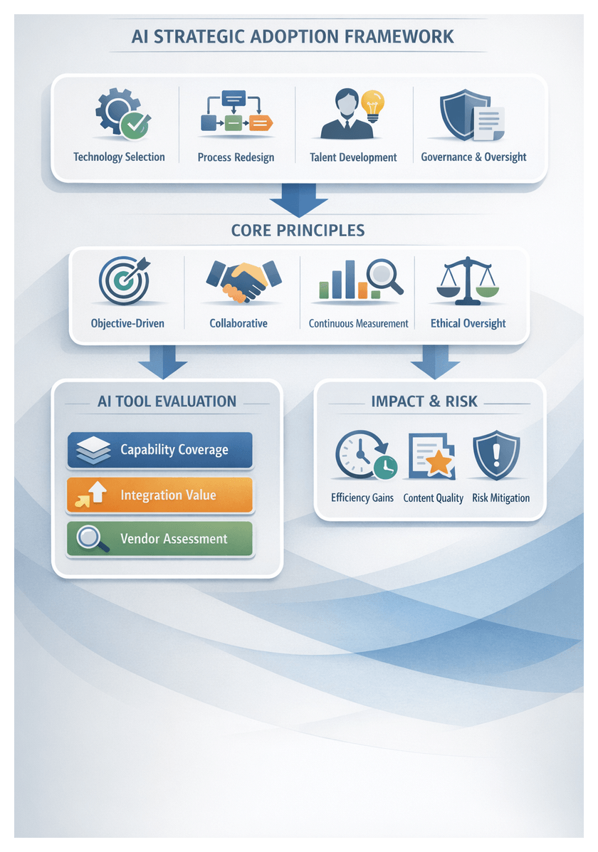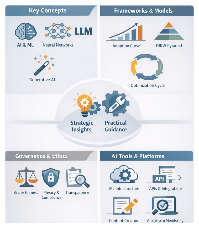 - Strategic Frameworks: Apply the Technology Adoption Life Cycle, Content Maturity Model, Value Chain Analysis, and Governance and Risk Frameworks to align AI initiatives with organizational objectives.