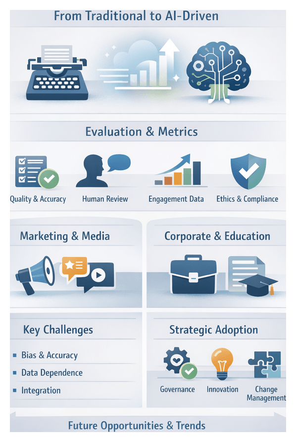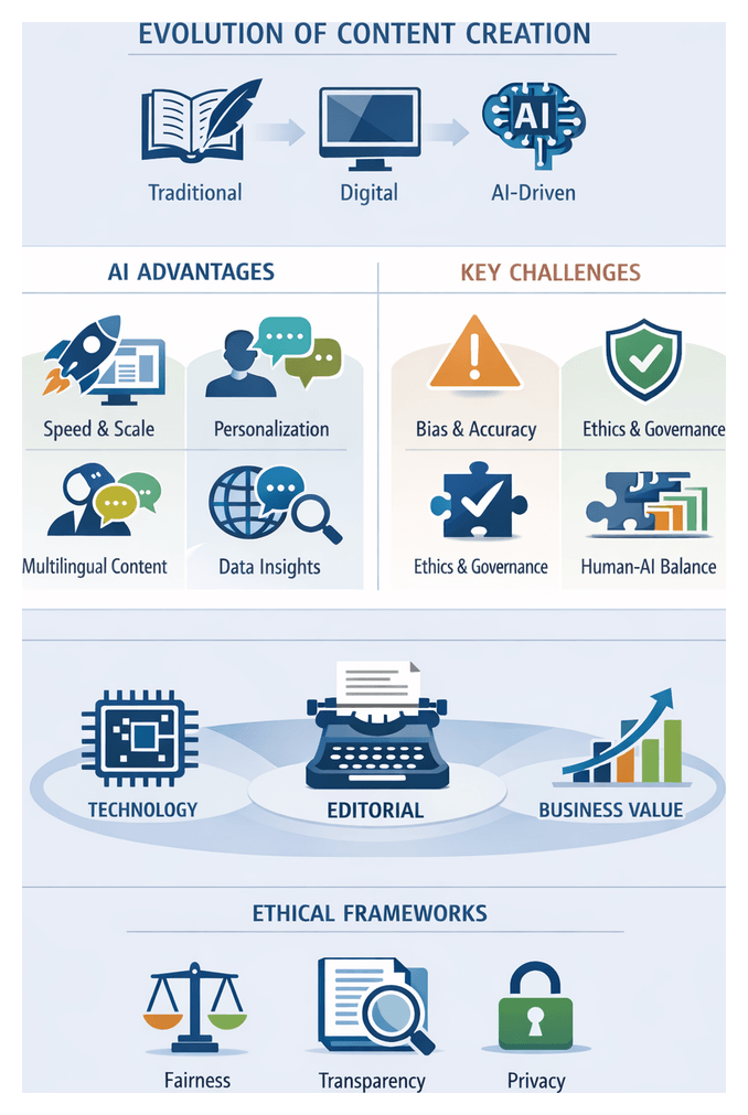 Content creation has evolved from fully manual workflows led by journalists, editors, and creative teams to an era where generative artificial intelligence dramatically reshapes editorial processes. As deep learning models transition from research prototypes to production services, organizations gain unprecedented ability to accelerate ideation, tailor messages at scale, and optimize distribution across digital channels. Yet integrating AI into established operations raises fundamental questions about quality, brand voice, ethics, and governance. This chapter traces the historical trajectory of content workflows, introduces analytical frameworks for evaluating AI-generated outputs, examines use contexts across industries, and outlines strategic considerations for sustainable adoption.