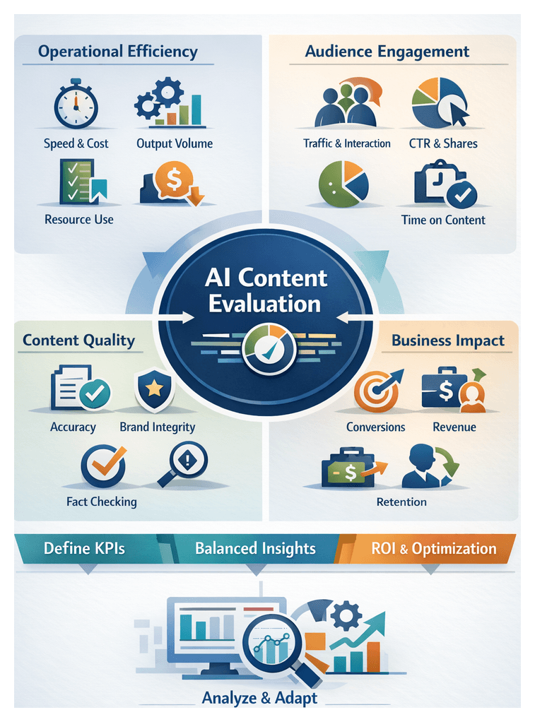 Evaluating AI-generated content demands a multi-dimensional approach that balances quantitative measures with qualitative assessments. Early benchmarks such as perplexity, BLEU, and ROUGE quantify fluency and n-gram overlap but overlook semantic richness and brand alignment. Leading practitioners now combine: