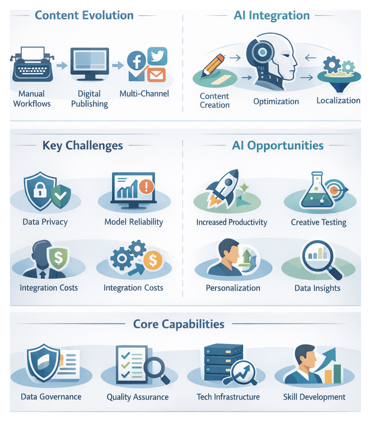 - Integration complexity: Embedding AI into existing CMS and workflows demands cross-functional coordination and change leadership.
