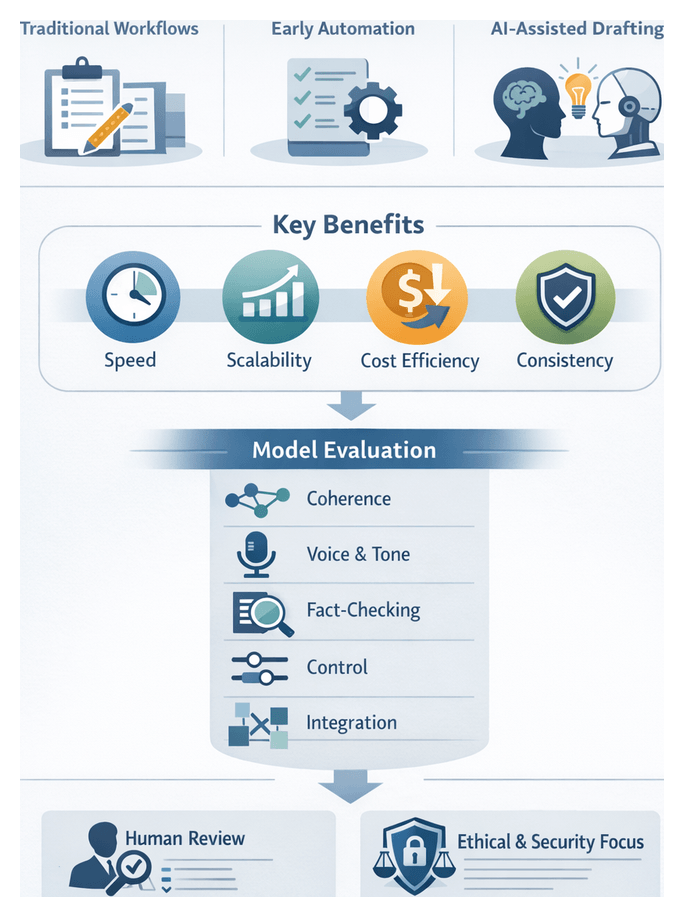 AI accelerates routine tasks—outlining, boilerplate drafting, research—allowing human experts to focus on investigative reporting, creative concept development, and strategic alignment. A hybrid human-AI model yields the greatest benefits in quality, efficiency, and innovation.