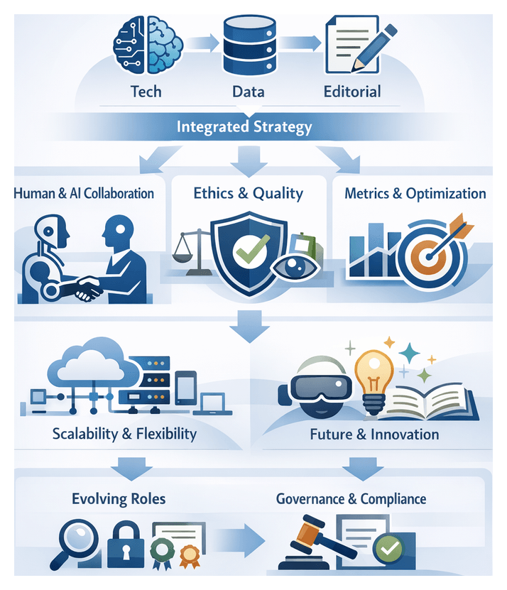 High-performing organizations adopt a human-in-the-loop editorial model in which AI generates initial drafts, human experts validate facts and refine tone, and compliance teams oversee legal and ethical adherence. Governance matrices define checkpoints, sign-off roles, and severity thresholds for AI interventions, ensuring accountability and quality.