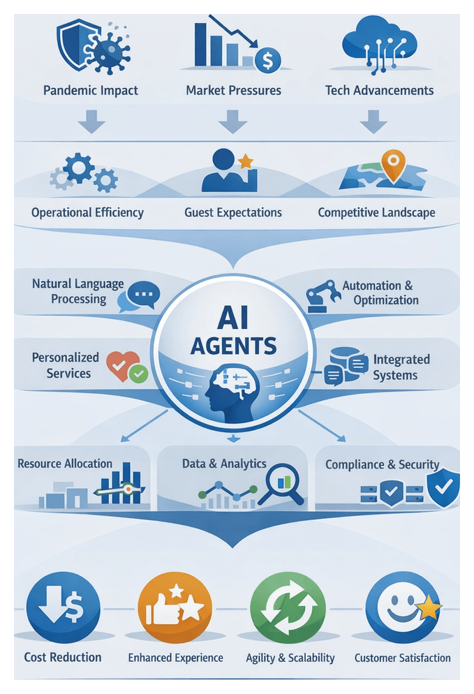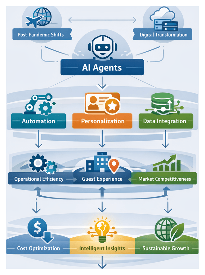 Entering 2026, the convergence of technological maturity, economic pressures, evolving consumer expectations and regulatory requirements makes intelligent automation a strategic imperative. Advances in natural language processing, real-time data streaming, edge computing, 5G connectivity and low-code development platforms have lowered barriers to enterprise-scale agent deployment. Pretrained foundation models enable powerful language understanding without extensive in-house training, while integration platforms as a service simplify orchestration between property management, CRM and revenue engines. These enablers democratize access to intelligent automation, allowing regional hotel groups and boutique operators to compete with global chains.