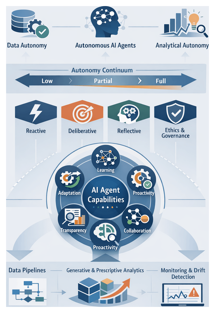 To guide agent selection and evaluation, practitioners employ interpretive taxonomies such as the autonomy spectrum, which ranges from assisted analysis—where agents suggest actions for human approval—to full autonomy, where agents manage entire analytical pipelines. The International Data Architecture Association’s functional taxonomy further categorizes agents by roles: exploratory profiling, predictive modeling, prescriptive optimization and monitoring. Socio-technical frameworks position agents within enterprise ecosystems of governance, data literacy and culture, emphasizing that technical proficiency alone is insufficient for success.