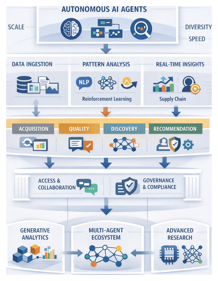 The analytics landscape has shifted from scheduled batch jobs and human-driven hypothesis testing to systems capable of continuous self-configuration. Autonomous AI agents leverage machine learning, natural language processing, and optimization algorithms to ingest diverse data sources, detect anomalies, retrain models in real time, and recommend actions. This evolution addresses challenges of scale, complexity, and speed by automating data quality monitoring, resource provisioning, and contextual reasoning, ultimately accelerating decision cycles and enabling organizations to manage information assets at unprecedented scale.