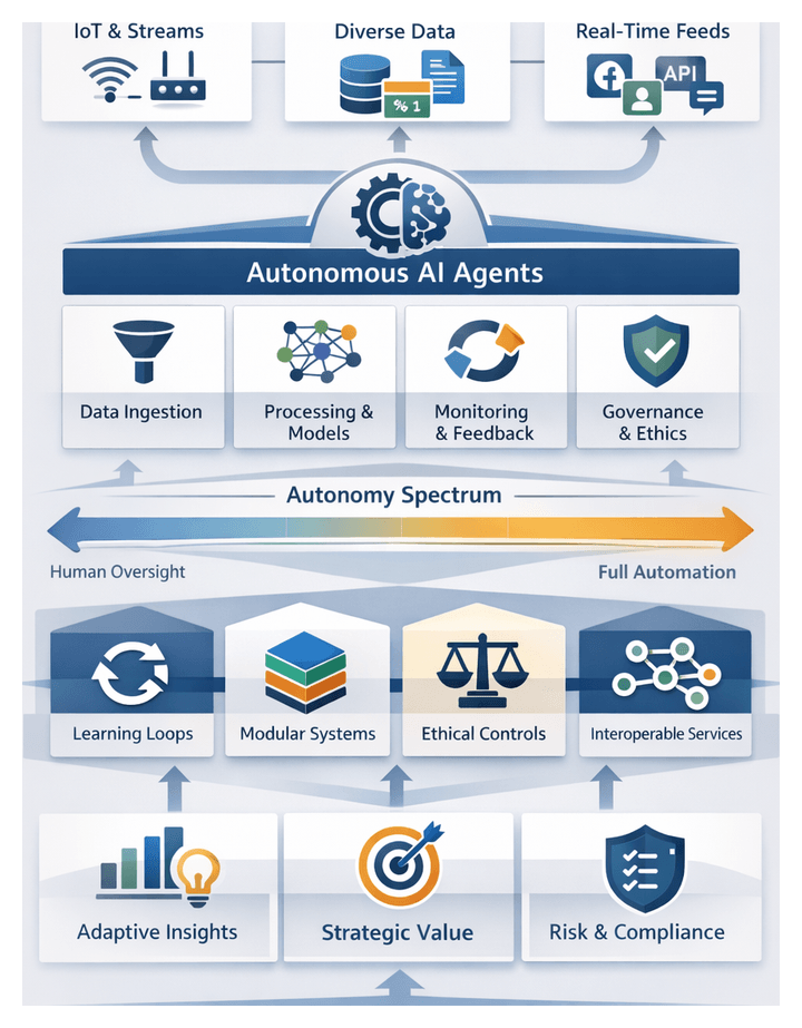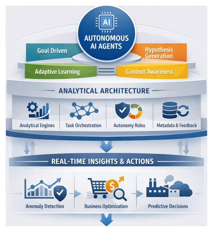 Analytical autonomy extends these principles by engaging agents in hypothesis generation, validation and refinement cycles. For example, an agent may detect a shift in customer churn rates, formulate causal hypotheses, test them against historical records and present findings along with confidence estimates. Decision mechanisms rely on statistical inference, optimization heuristics and machine learning techniques such as supervised, unsupervised, reinforcement and transfer learning. Reinforcement learning optimizes long-term objectives through trial-and-error, while probabilistic models quantify uncertainty and guide data acquisition when confidence is low. Rule-based components encode domain expertise and governance constraints, aligning agent behaviors with organizational policies.