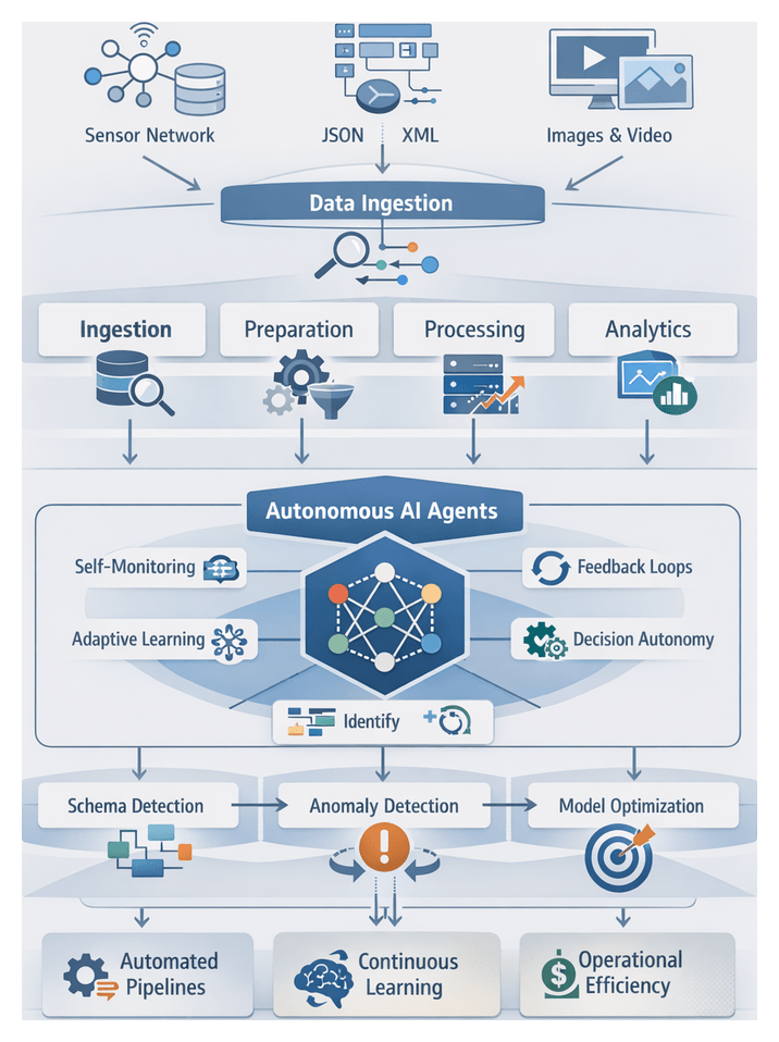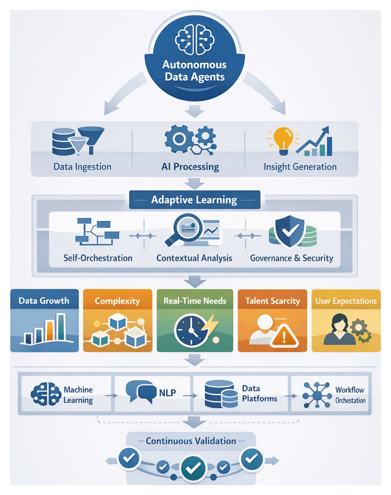 Organizations today face unprecedented volumes, varieties, and velocities of data across every function and industry. Early digital transformation efforts centralized information into relational warehouses and business intelligence platforms. With the advent of cloud-native solutions like Snowflake and Databricks, enterprises built sprawling data lakes and real-time ingestion pipelines. At the same time, sources such as Internet of Things devices, mobile apps, and social media introduced unstructured and semi-structured streams that overwhelmed manual extract-transform-load processes and static reporting. In response, data autonomy has emerged as a strategic imperative, embedding intelligence into analytics workflows through self-directed AI agents that generate proactive insights and orchestrate end-to-end processes without constant human intervention.