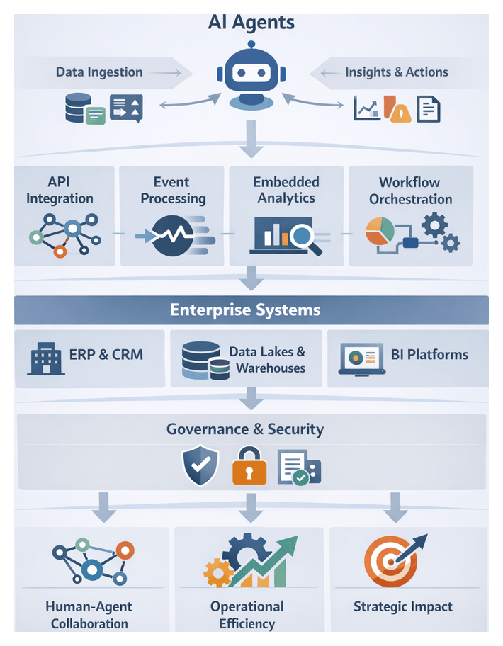 Adopt an API-first design exposing REST or gRPC endpoints, leverage event-driven architectures with Kafka or EventBridge, embed agents in BI platforms like Power BI or Tableau, and use orchestration tools such as Apache Airflow or Kubeflow.