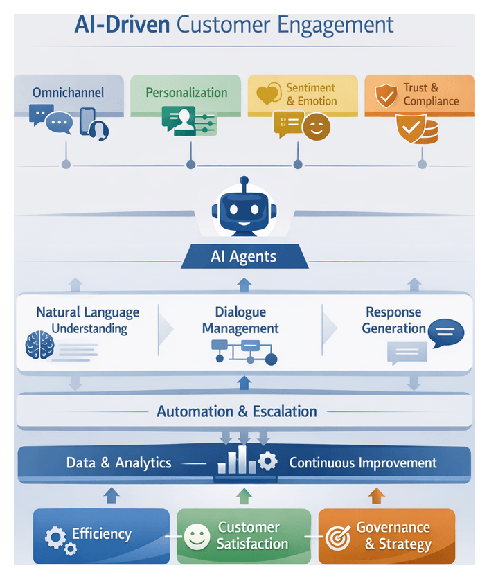 - Logic-Model Framework—Links inputs (data, technology, talent) to activities (model training, integration), outputs (deployed agents, deflected interactions) and outcomes (satisfaction, cost savings).