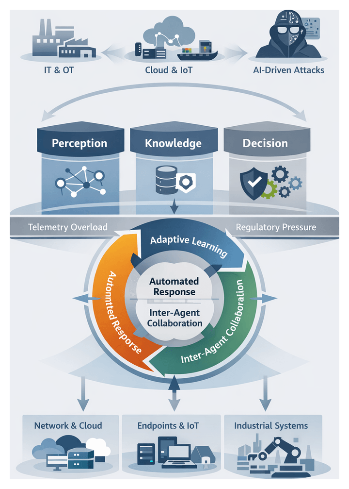 - Perception: Continuous ingestion and interpretation of network flow, endpoint activity, application logs and IoT telemetry to capture a comprehensive view of the threat surface.