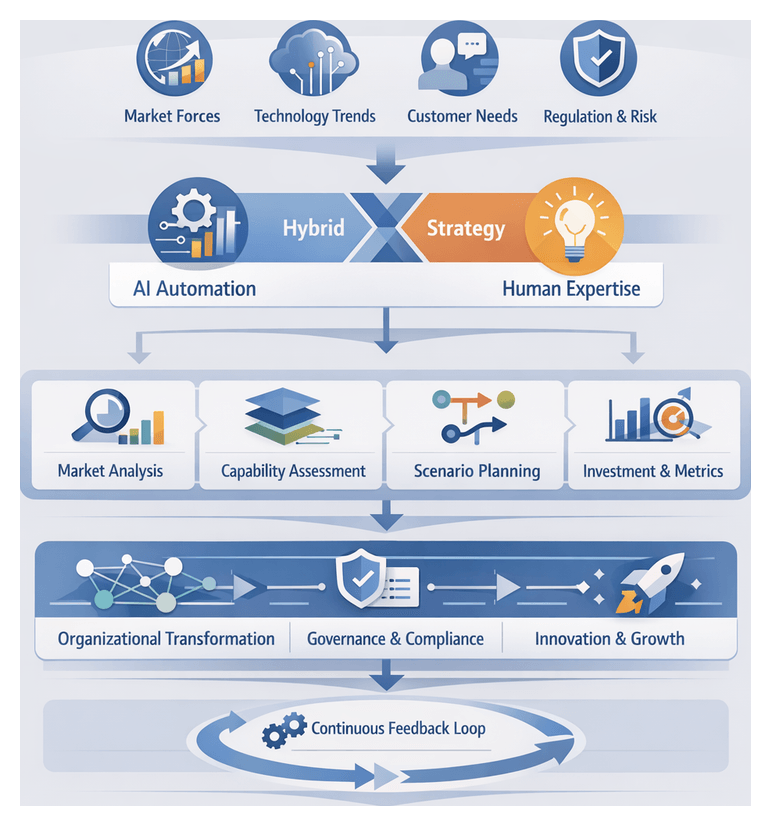 Strategic planning leverages established models to align AI-human initiatives with market and organizational imperatives: