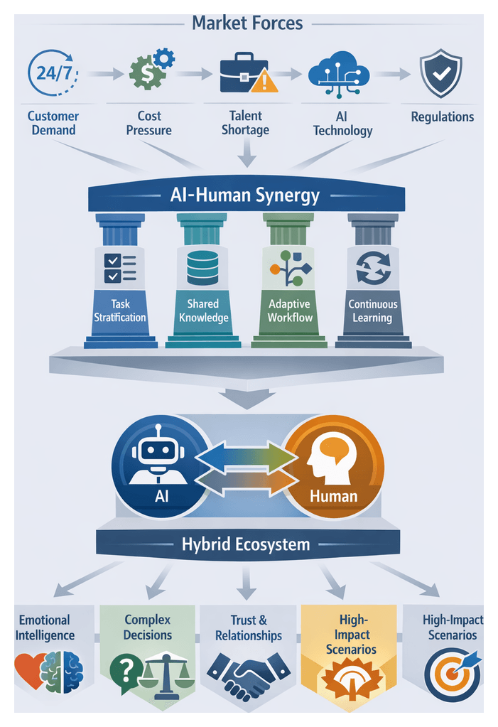 The convergence of technological maturity, market expectations, and strategic imperatives makes this a critical moment for adopting hybrid AI-human ecosystems. Key technological enablers include: