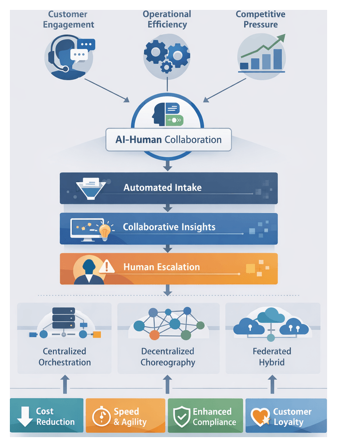 3. Dynamic Hand-Off Model: Orchestration engines monitor context, performance metrics, and compliance triggers to route tasks in real time between AI and human agents.
