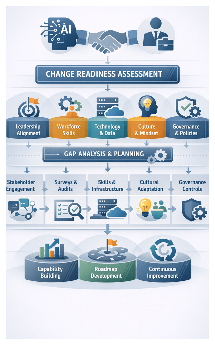 1. Diagnostic Assessment: Audit existing workflows, data infrastructures, governance frameworks, and skill inventories.