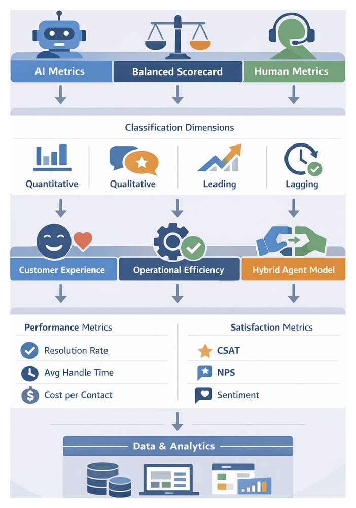 • Balanced scorecards integrate financial, customer, internal process and learning perspectives, tracking metrics such as cost per interaction, Net Promoter Score, average handle time and model improvement rates.