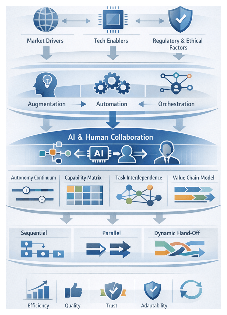 • An interpretive framework for classifying tasks by cognitive load, emotional risk, and strategic value, mapping them to augmentation, automation, or orchestration archetypes.