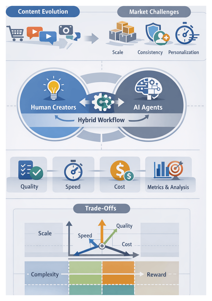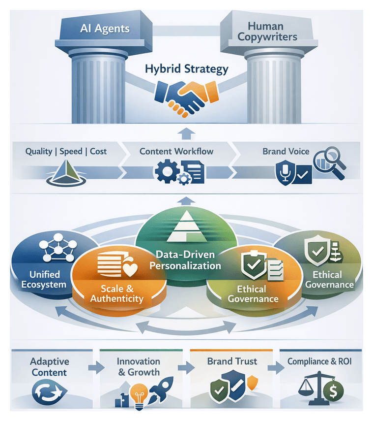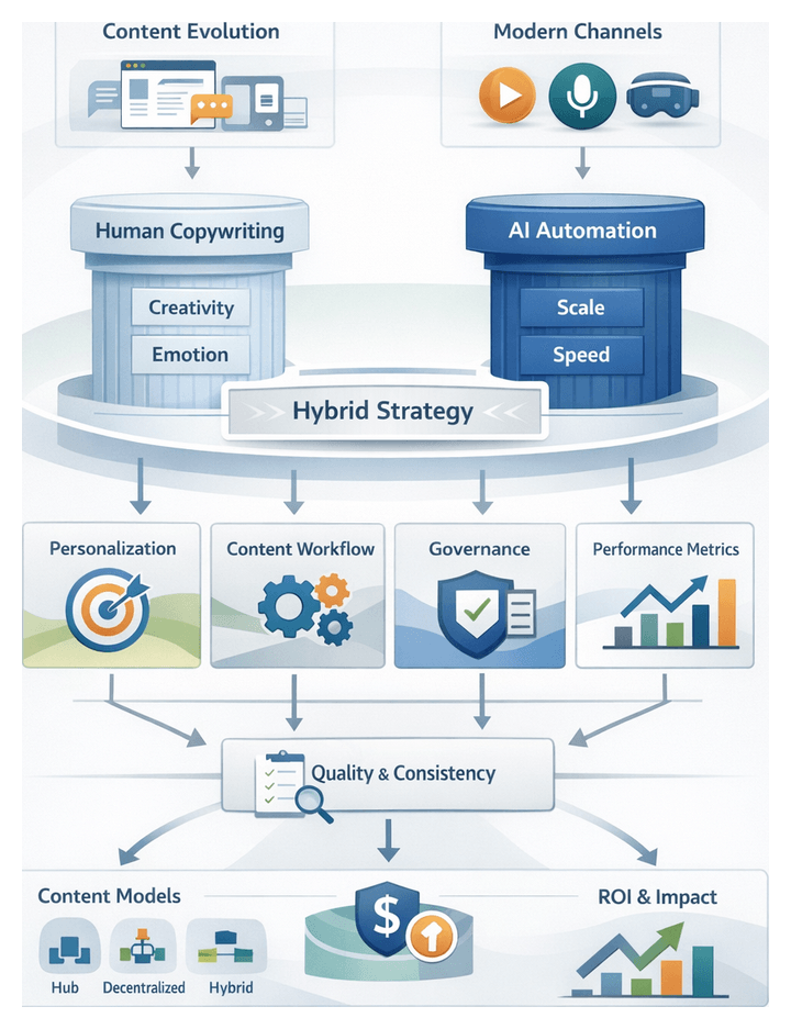 A hybrid model, where AI produces first drafts, humans refine tone and context, and governance frameworks enforce consistency, unlocks the strengths of both modalities. Layered authorship, creative exchange loops, and quality calibration indices help organizations iteratively improve outputs and retrain AI agents on brand-specific corpora.