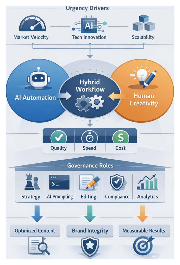 • Governed Hybrid Workflows: Clear roles, approval gates, and feedback loops ensure consistency and accountability.