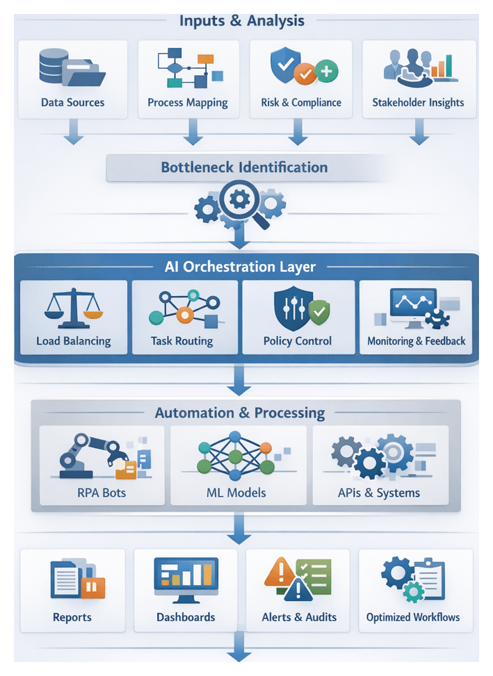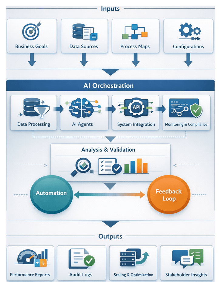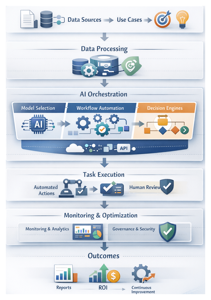 Point solutions, one-off scripts, and siloed automations often deliver short-term gains but fail to scale without a cohesive orchestration framework. Structured orchestration unifies dispersed automation efforts, enforces consistency, and provides end-to-end visibility across complex, multi-system workflows. By imposing a formal workflow blueprint, enterprises reduce technical debt, strengthen governance, and ensure reliable performance as processes evolve.