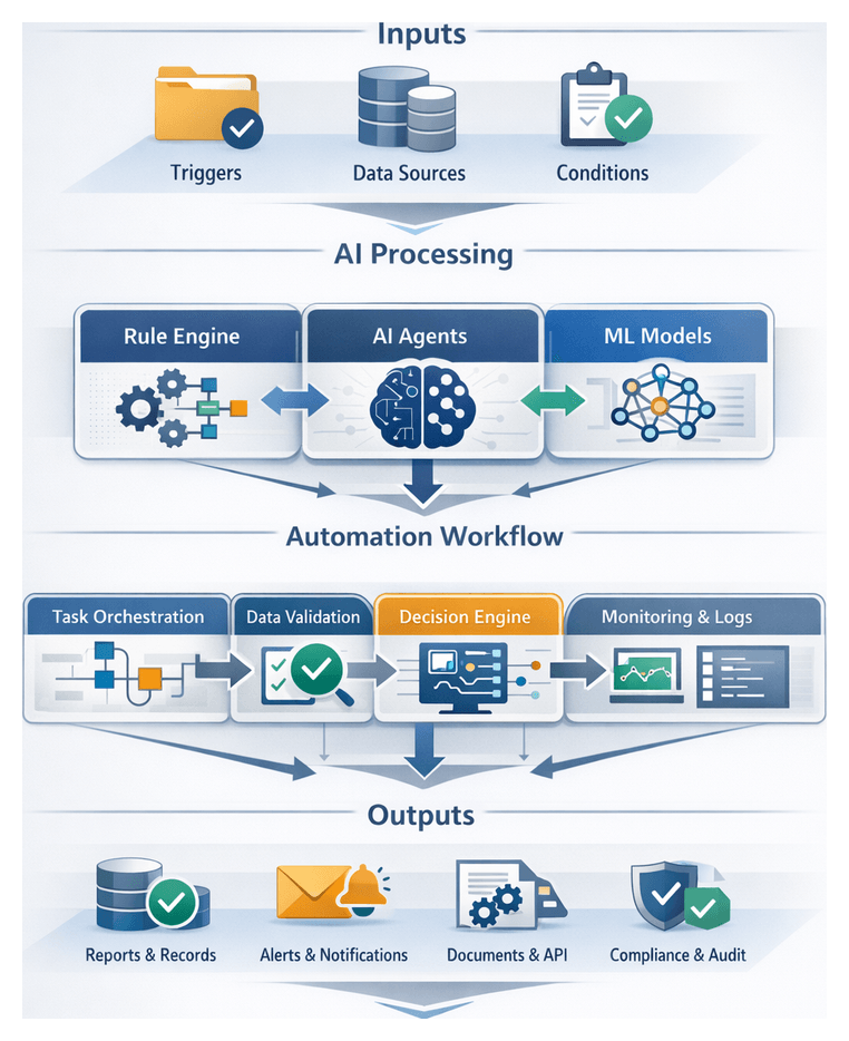 - Input Processing Agents ingest and normalize raw inputs—scanning documents, parsing unstructured text, and validating data accuracy.