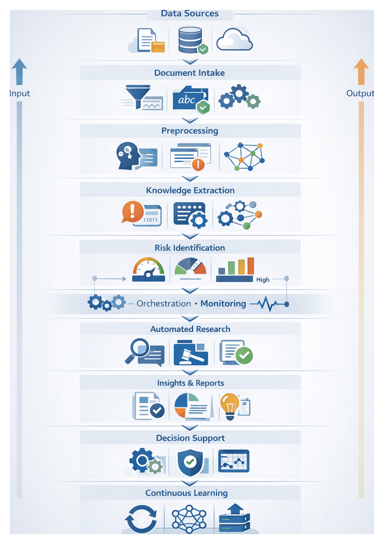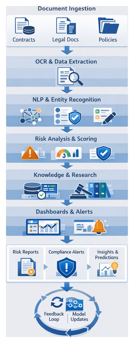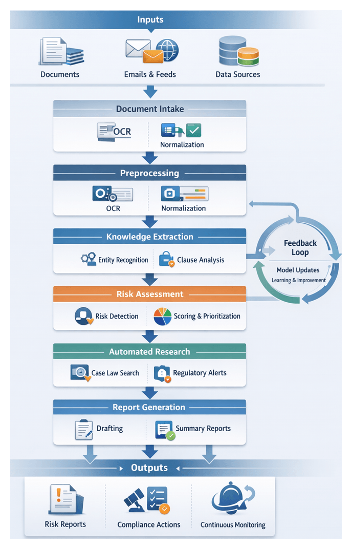 - Document Intake System: Ingests contracts, case files, regulatory texts and external feeds via upload portals, email services or APIs.