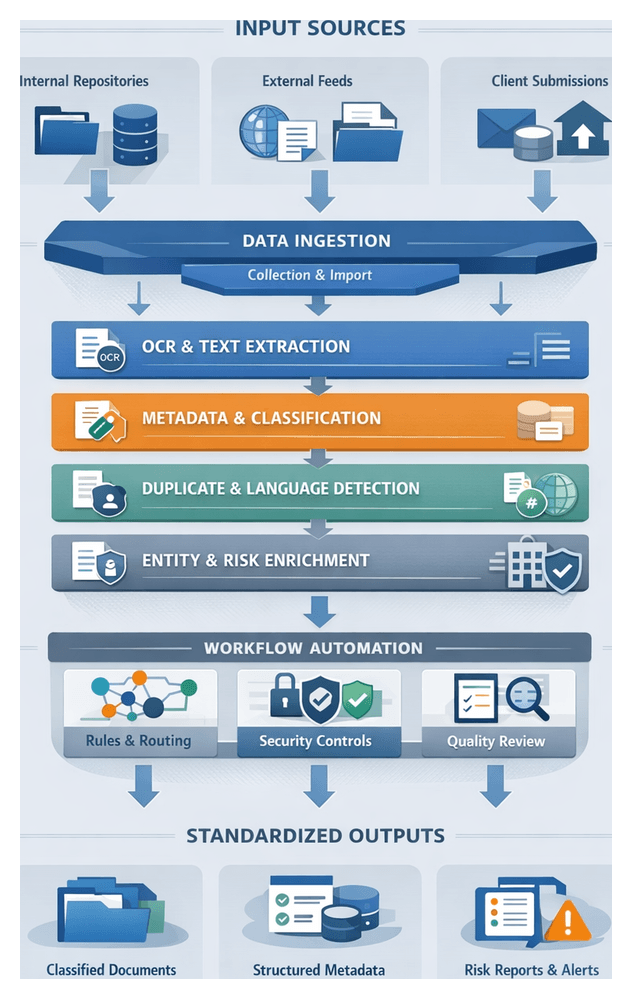 - Ingestion: Documents enter via portals, email connectors or APIs and are cataloged with preliminary metadata.