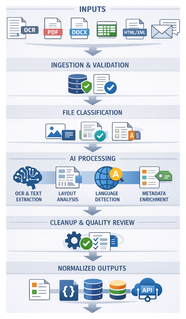 - Preprocessing: OCR engines and format converters produce normalized text formats stored in a unified repository.