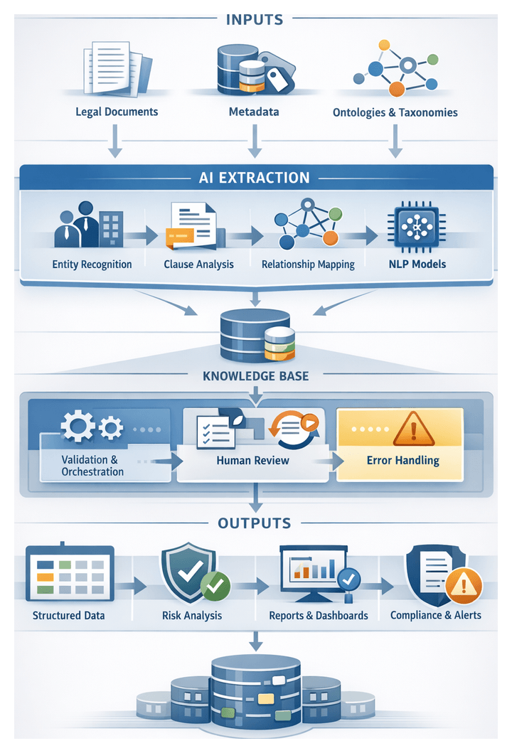 - Extraction: NLP engines extract parties, dates, obligations and clauses, populating a knowledge graph.