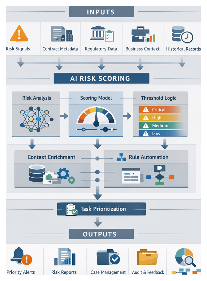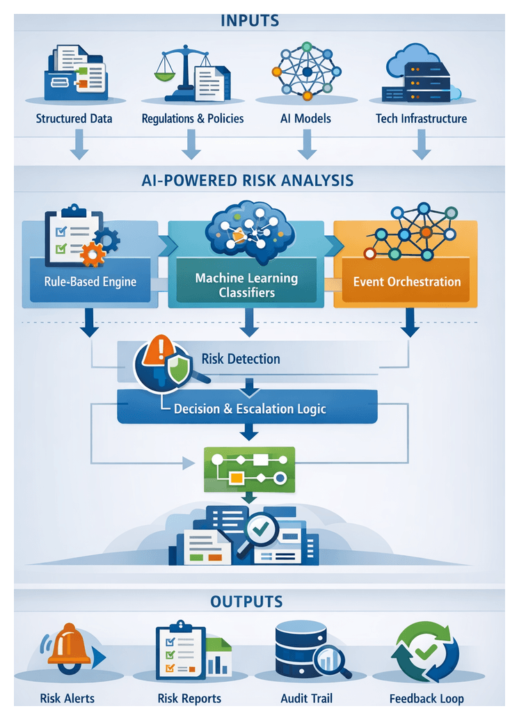 - Risk Identification and Classification: Generates risk flags and preliminary categories using policy engines and ML classifiers.