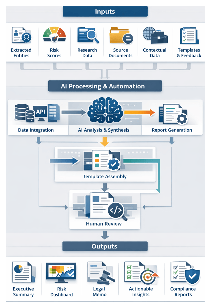 - Drafting: NLG modules compile executive summaries and dashboards for review.