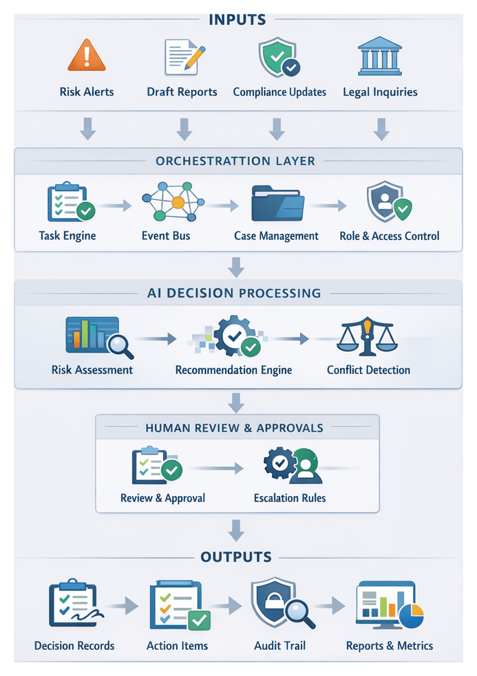 - Decision Support and Orchestration: Assigns tasks, logs approvals and routes action items to compliance processes.