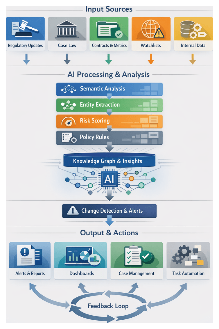 - Regulatory Alerts: Change-detection algorithms compare new regulations against existing obligations and trigger notifications.