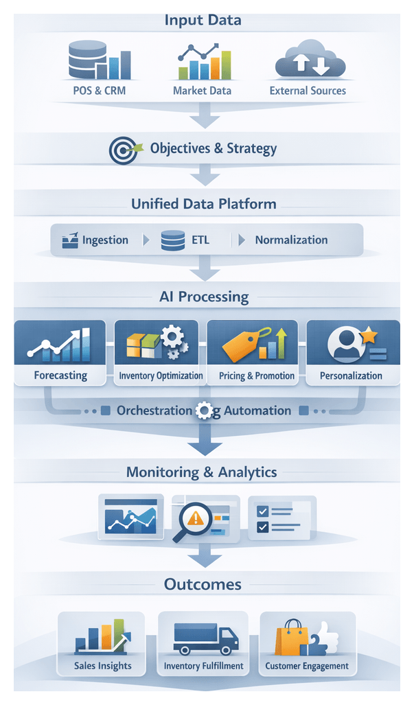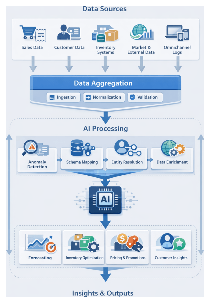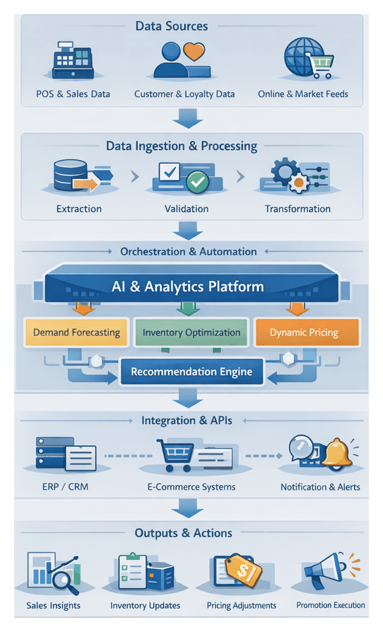 A unified workflow orchestrates data, insights and decisions across the retail sales ecosystem. Transactional, customer and inventory data flow into a centralized platform. AI agents then execute forecasting, optimization and recommendation tasks. Integration services validate outputs, route information to downstream systems or human actors and ensure transparency, speed and accuracy in delivering actionable intelligence to planning, operations and store teams.
