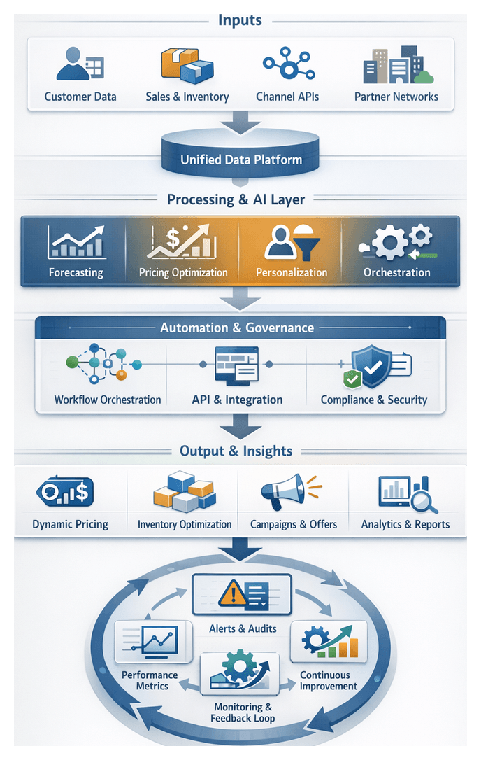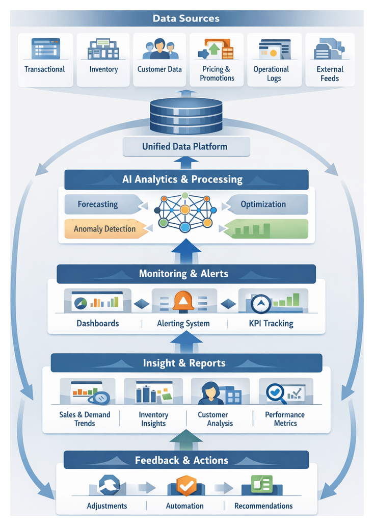 - Performance Monitoring: Dashboards track forecast accuracy, price elasticity responses and inventory turns.