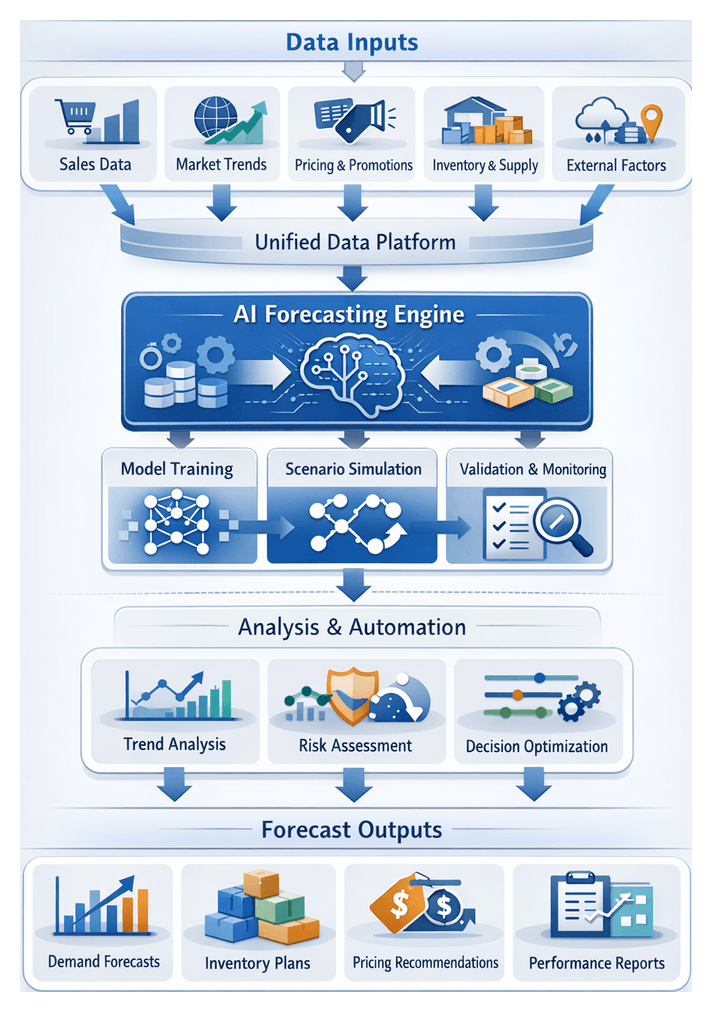 - Delivery: Forecasts are served via APIs or message queues to inventory and pricing modules.