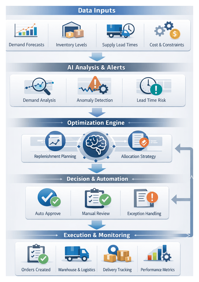 - Replenishment Planning: Multi-echelon optimization in platforms like Blue Yonder Luminate or RELEX Solutions.