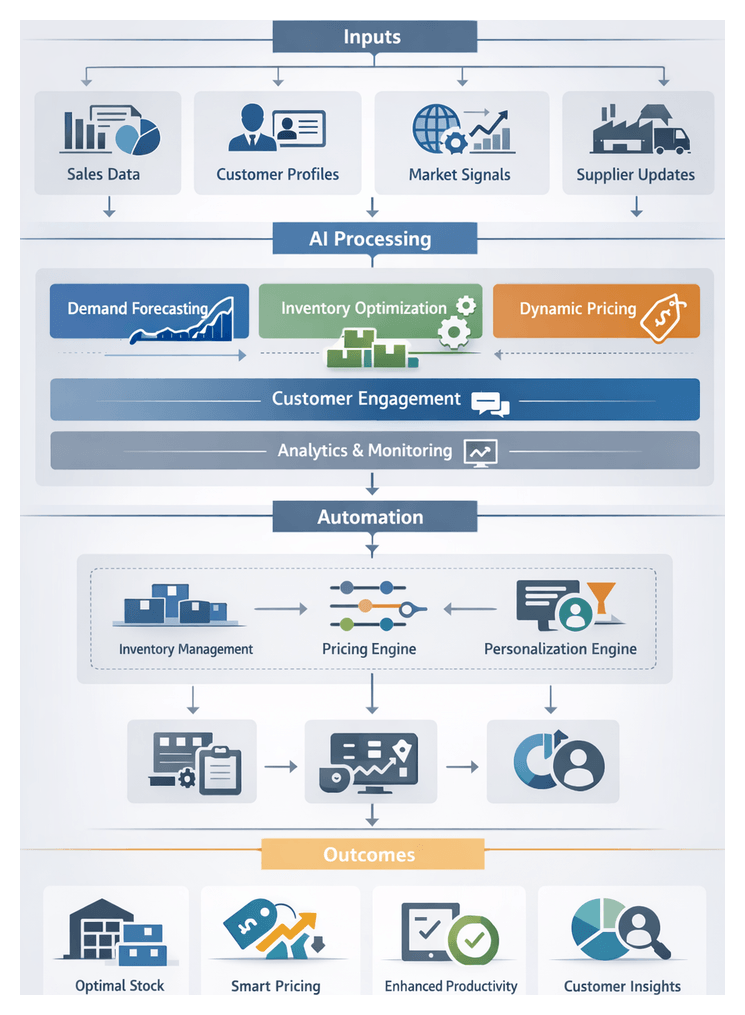 Advanced AI modules—forecasting agents, inventory optimization, dynamic pricing and in-store assistants—integrate with supporting systems to form a unified sales workflow. Each capability contributes distinct value, from demand prediction to personalized customer engagement.