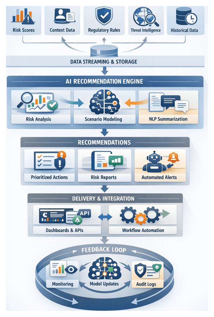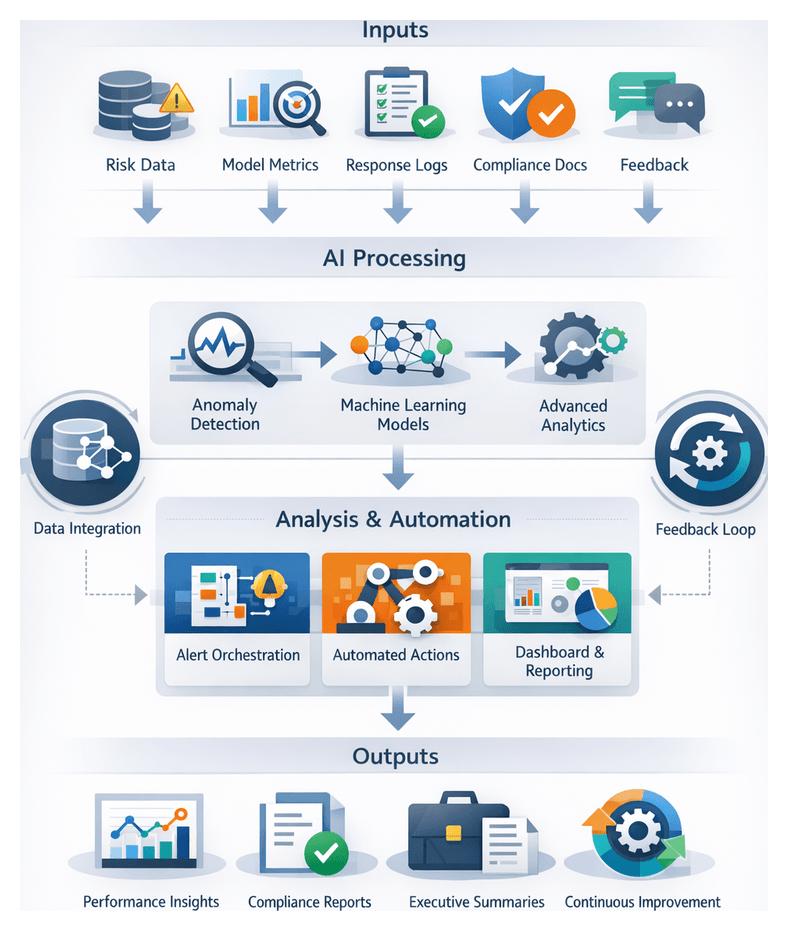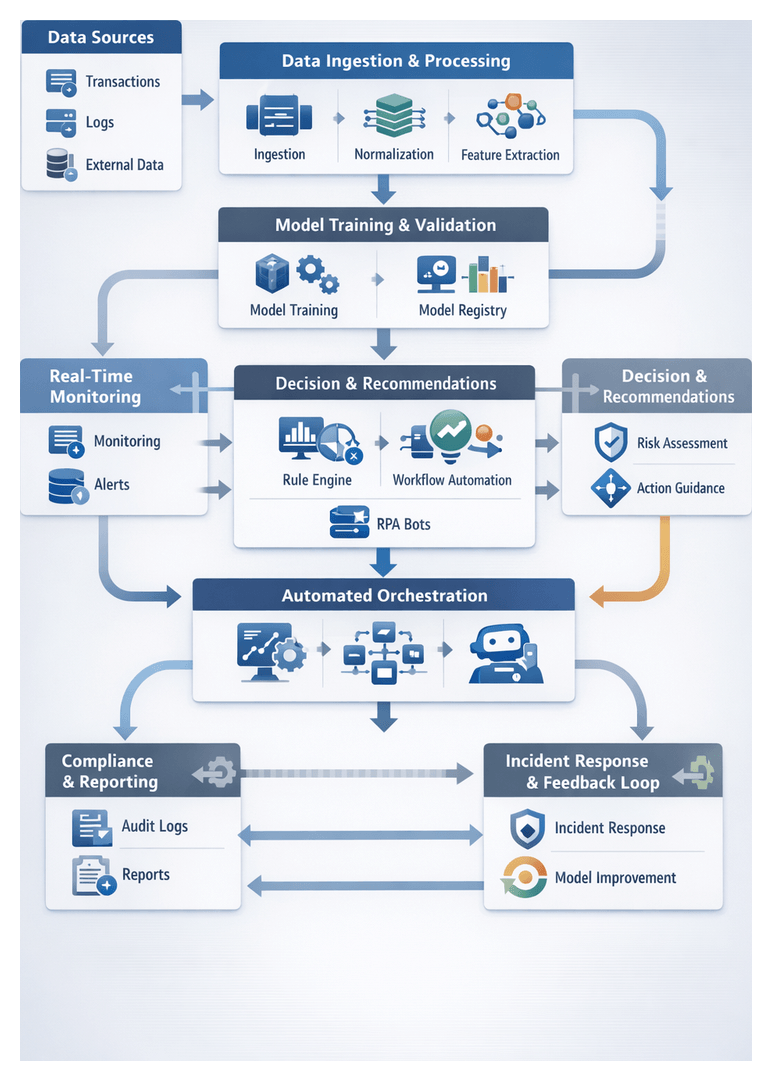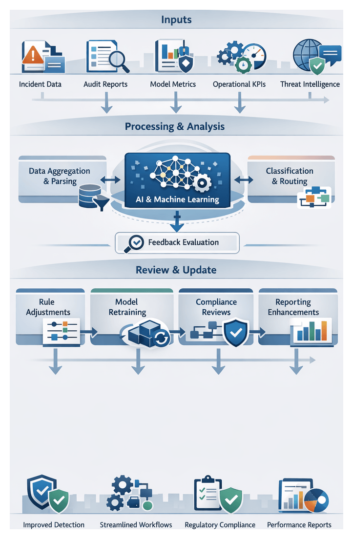 Feedback from incident outcomes, audit findings and policy changes feeds automated retraining pipelines and policy management modules. Automated schedulers, experiment tracking dashboards and simulation environments support model refinement and safe deployment of workflow updates.