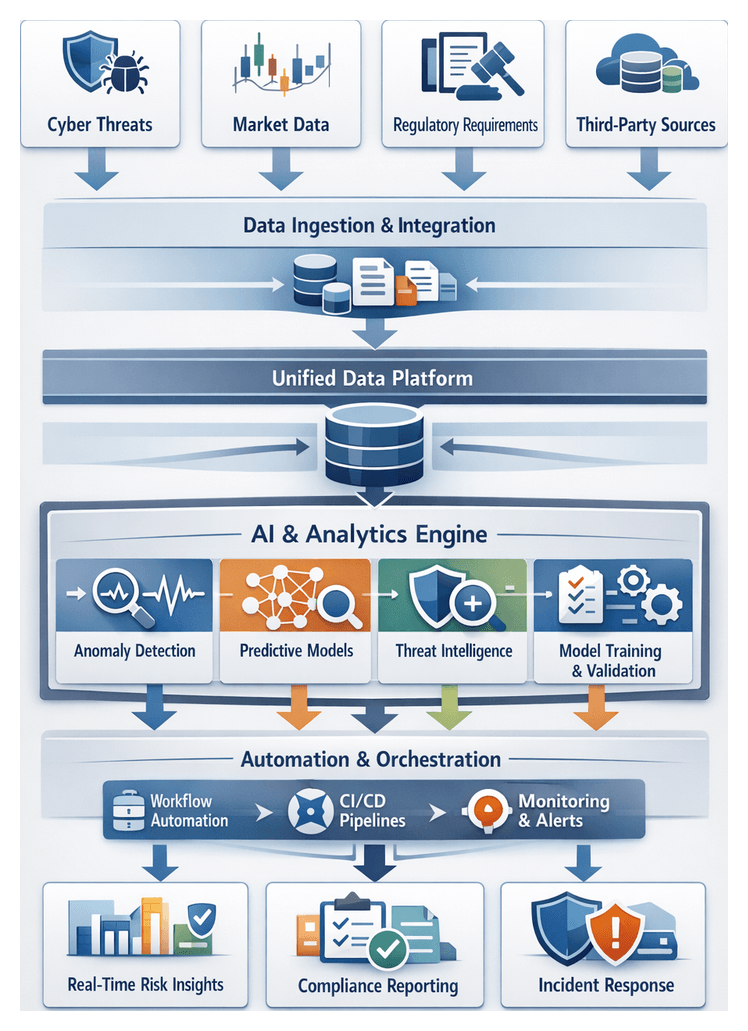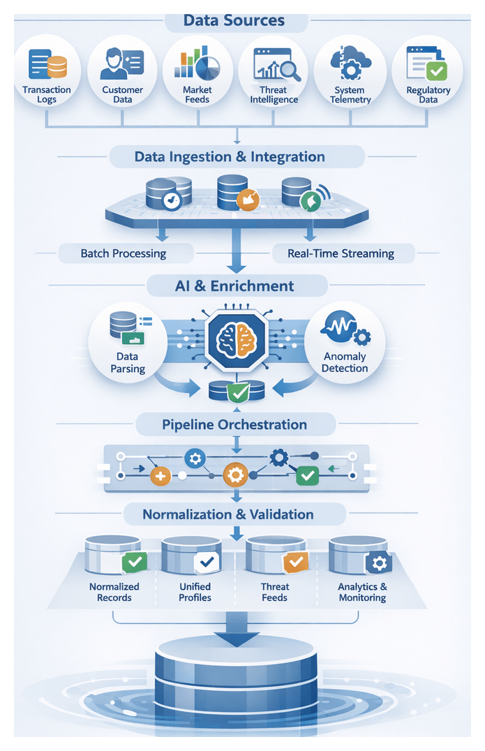 Establishing a unified foundation for AI-driven risk mitigation begins with systematic data ingestion from internal and external sources. Financial institutions must collect transaction logs, customer profiles, market data, threat intelligence, and system telemetry into a consistent, high-quality dataset. This layer accelerates downstream analytics, anomaly detection, and automated decision support while enforcing governance controls.