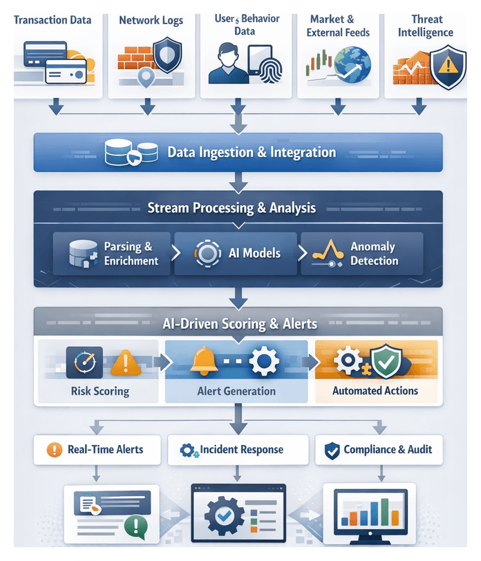 - Transaction Logs: Payments, transfers, trade executions, and settlement events from core banking, trading, and payment platforms.