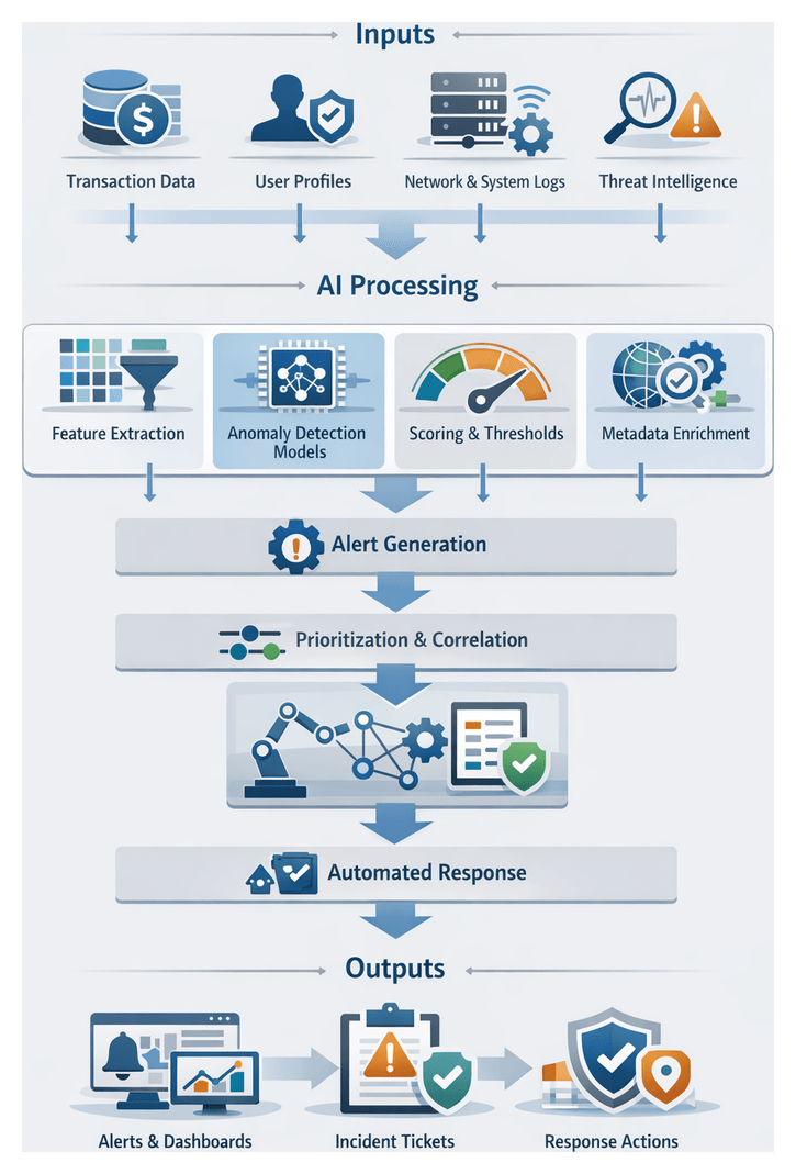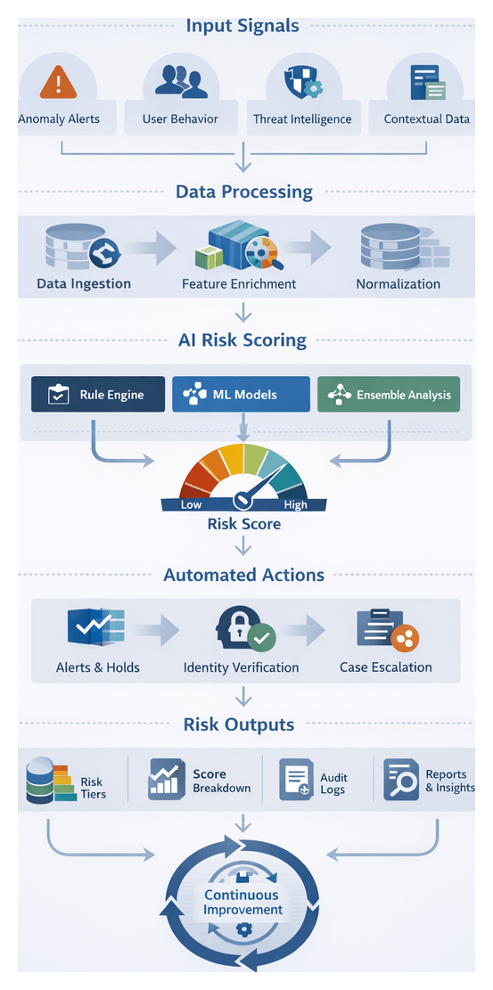Risk scores trigger automated workflows and alerts. Business logic engines enforce thresholds, prompting transaction holds, multi-factor authentication challenges or analyst review. Core components include:
