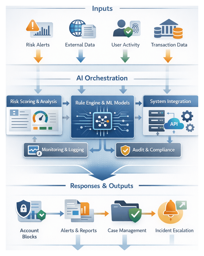 - Orchestration engine connectors to invoke identity verification, transaction holds and compliance report generators