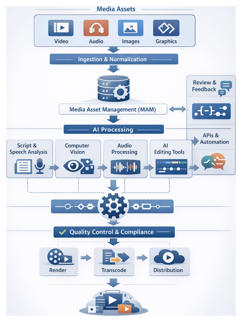 Modern workflows span on-set capture tools, cloud asset management platforms and AI engines. A unified orchestration layer monitors system events, triggers automated tasks and manages notifications to keep producers, editors, sound designers, colorists and compliance officers aligned.