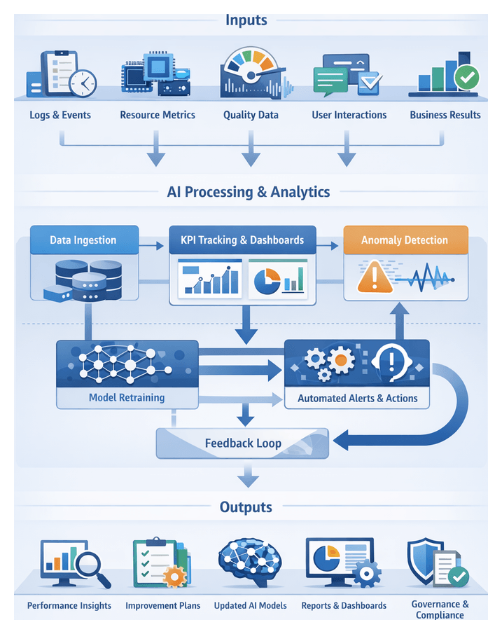 Telemetry agents collect processing times, error rates and resource usage. Dashboards built on Tableau or Power BI visualize key performance indicators. AI-driven insights predict bottlenecks and recommend optimizations, while periodic model retraining incorporates annotated corrections, driving continuous workflow enhancements.