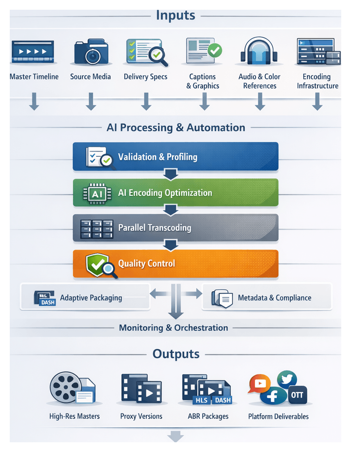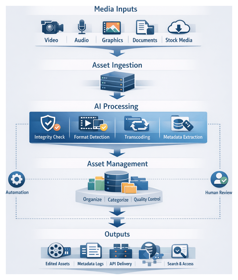 Event-driven engines classify file types and invoke AWS Elemental MediaConvert for transcoding. A metadata bus records technical attributes and provenance. Automatic checksum verification and version control eliminate manual errors, while a unified catalog presents AI-suggested tags based on scene context.
